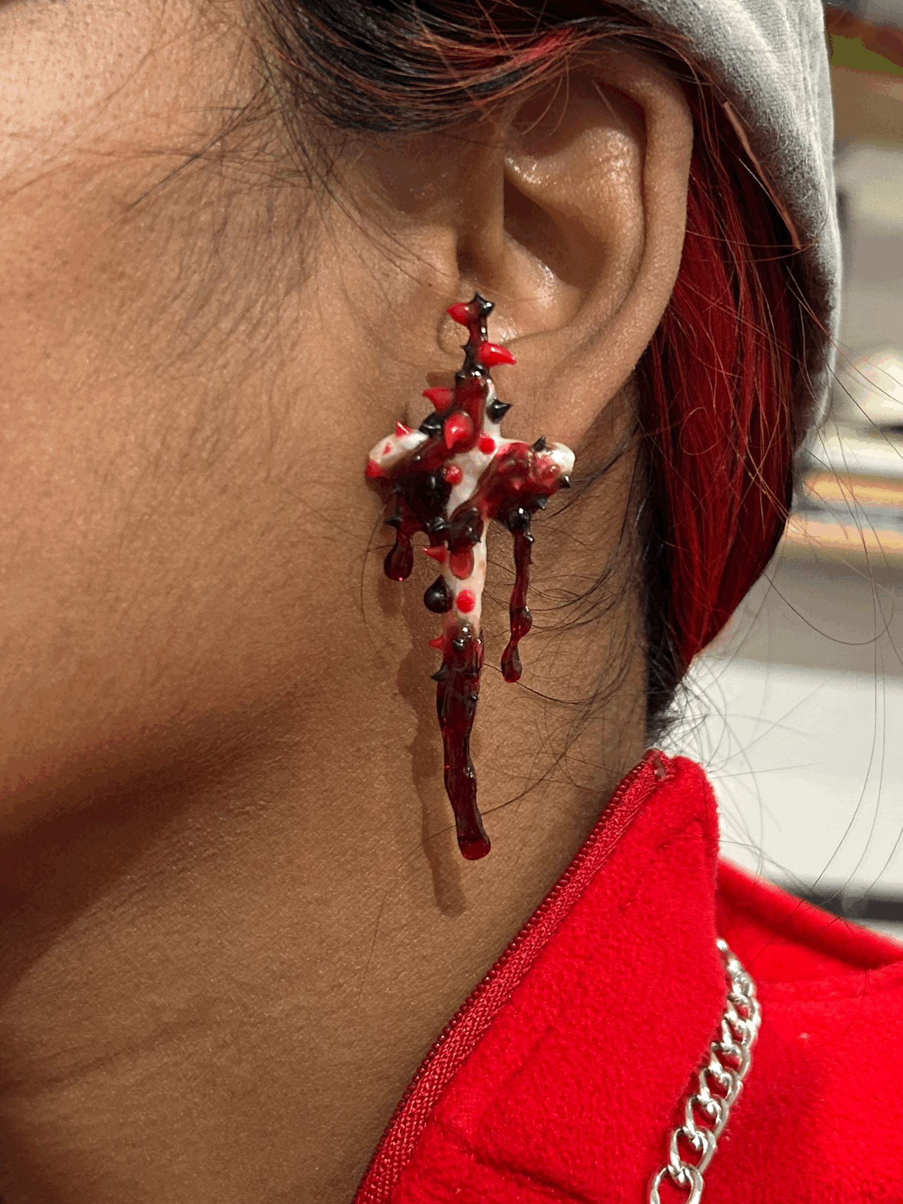 Handcrafted sculptural earrings featuring a bold black and red spiked design.